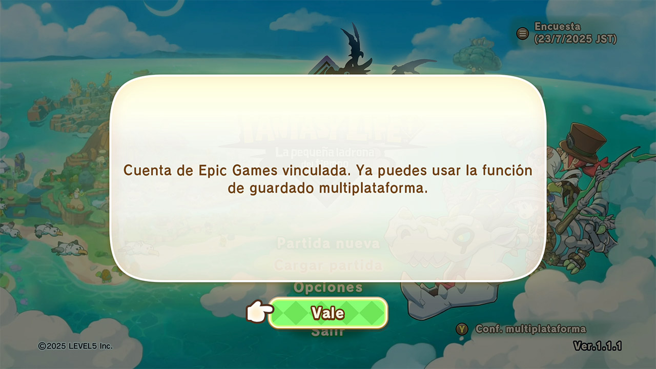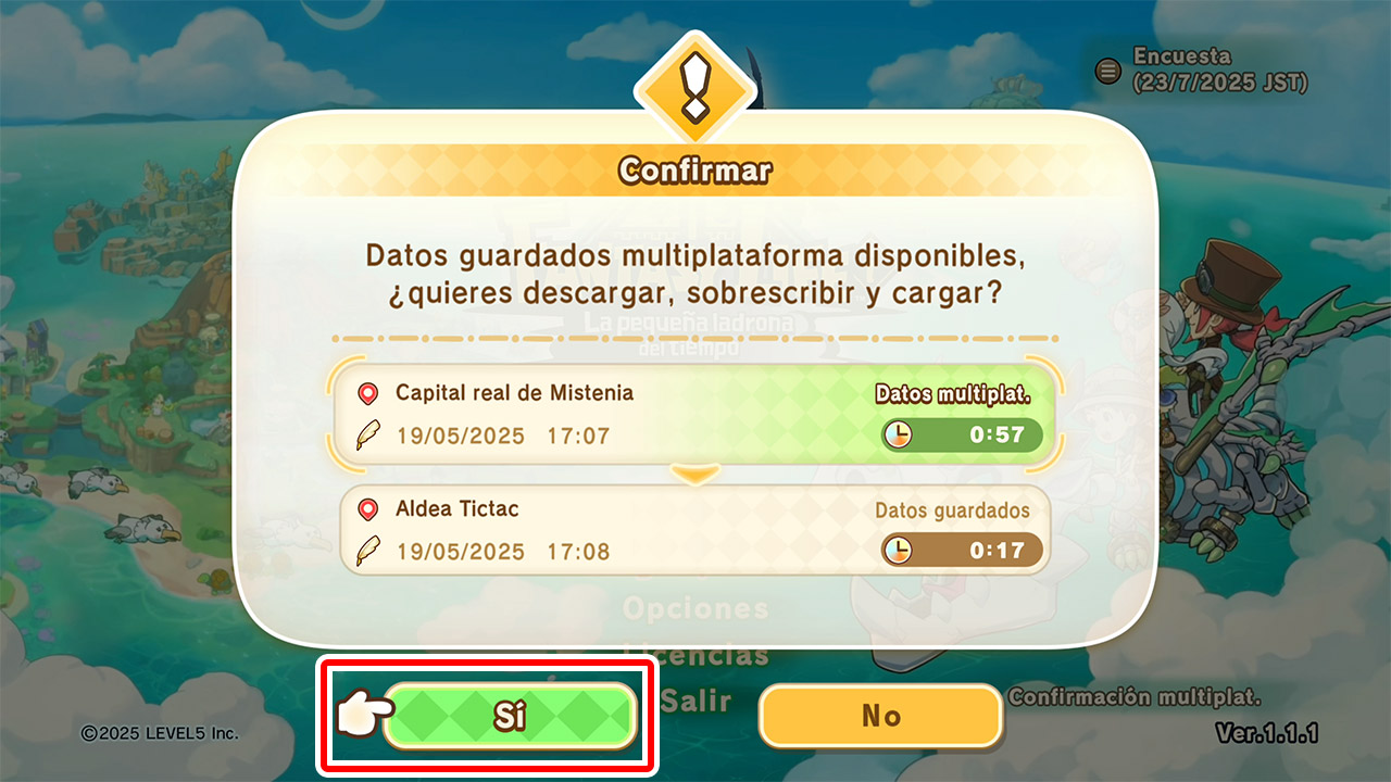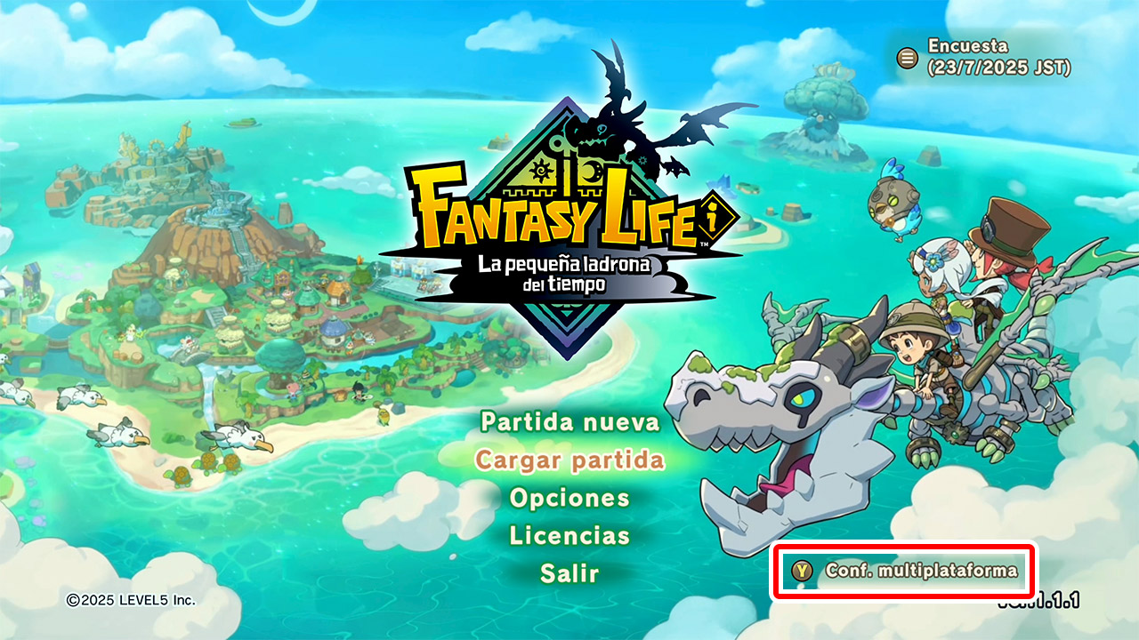 Inicia «FANTASY LIFE i: La pequeña ladrona del tiempo» en la plataforma en la que quieras cargar los datos multiplataforma y pulsa el botón correspondiente en la pantalla de título.