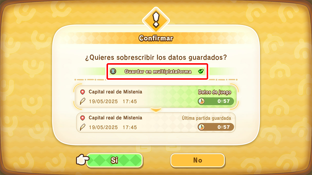 Selecciona la opción de «Guardar en multiplataforma» en el menú de guardado de la plataforma en la que quieras activar la función. Guarda la partida.
