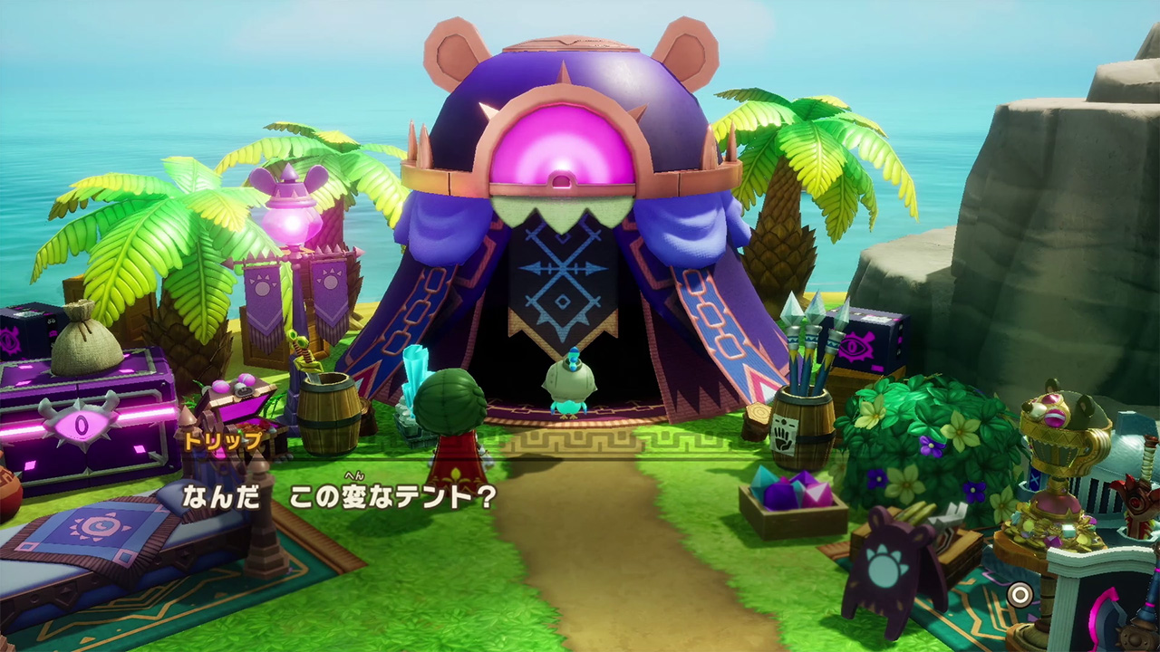 拠点の北東エリアに出現する怪しげなテントを調べると遊ぶことができるようになります。 - ※怪しげなテントはメインストーリー第3章、拠点の掲示板クエスト解放後に出現します。