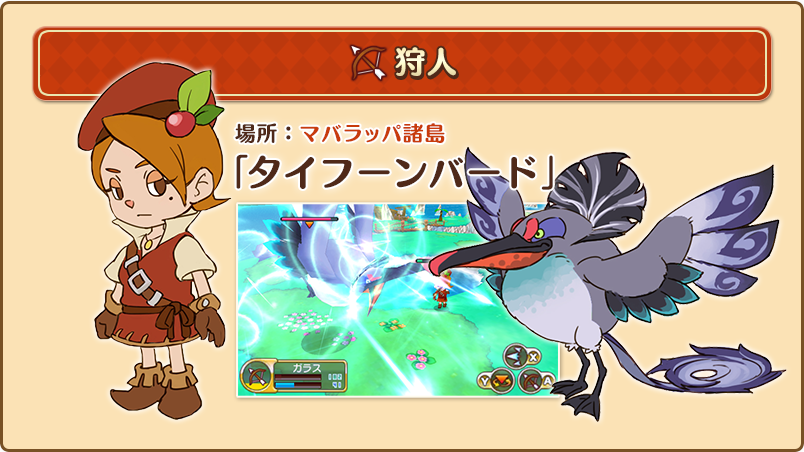 タイフーンバード/竜巻に囲まれたらもう逃げられない!!/マバラッパ諸島に現れた「タイフーンバード」。周囲の空間にいくつもの竜巻 を瞬時に生み出し、プレイヤーの逃げ場を塞ぐ!竜巻に触れれば大ダメージが!!/この他にも新たな敵が多数登場!